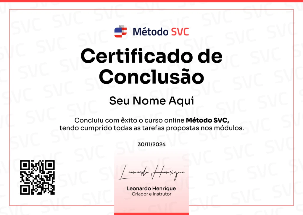 No final do curso você receberá o seu certificado em formato digital para atestar sua participação e conclusão do Método SVC.